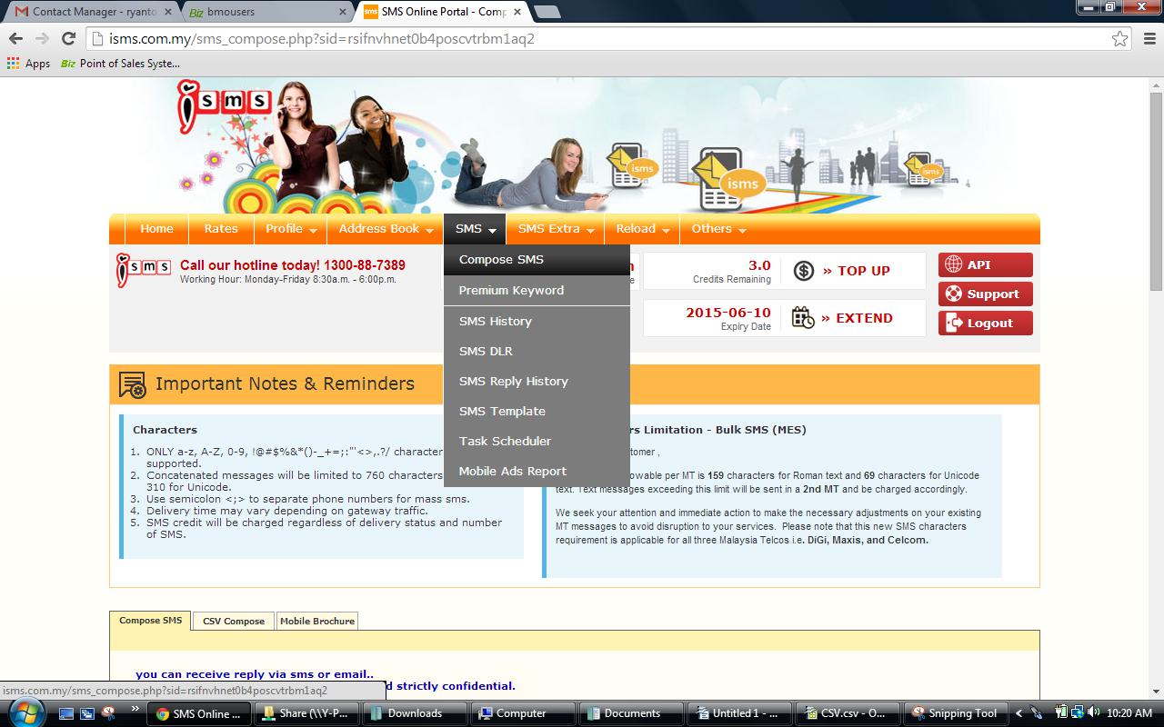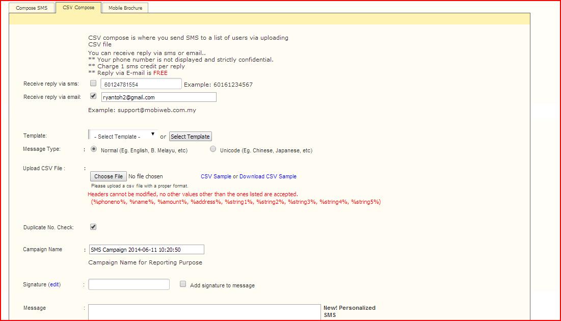 Step 7 : To change the format of the csv file. We can follow the CSV Sample in the isms.com.my. Login to your ISMS account > > SMS > > Compose SMS >> CSV Compose.