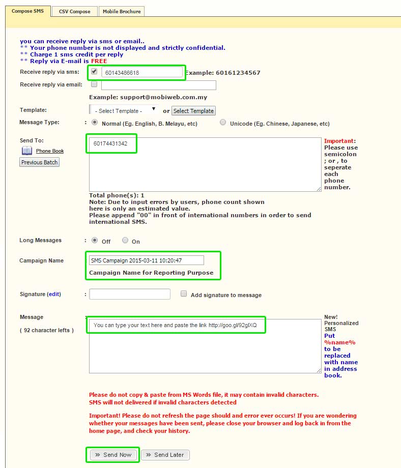 NOTE: To create Google URL Shortener, please refer to the steps above. Google URL Shortener can greatly reduce the number of characters when composing your SMS.